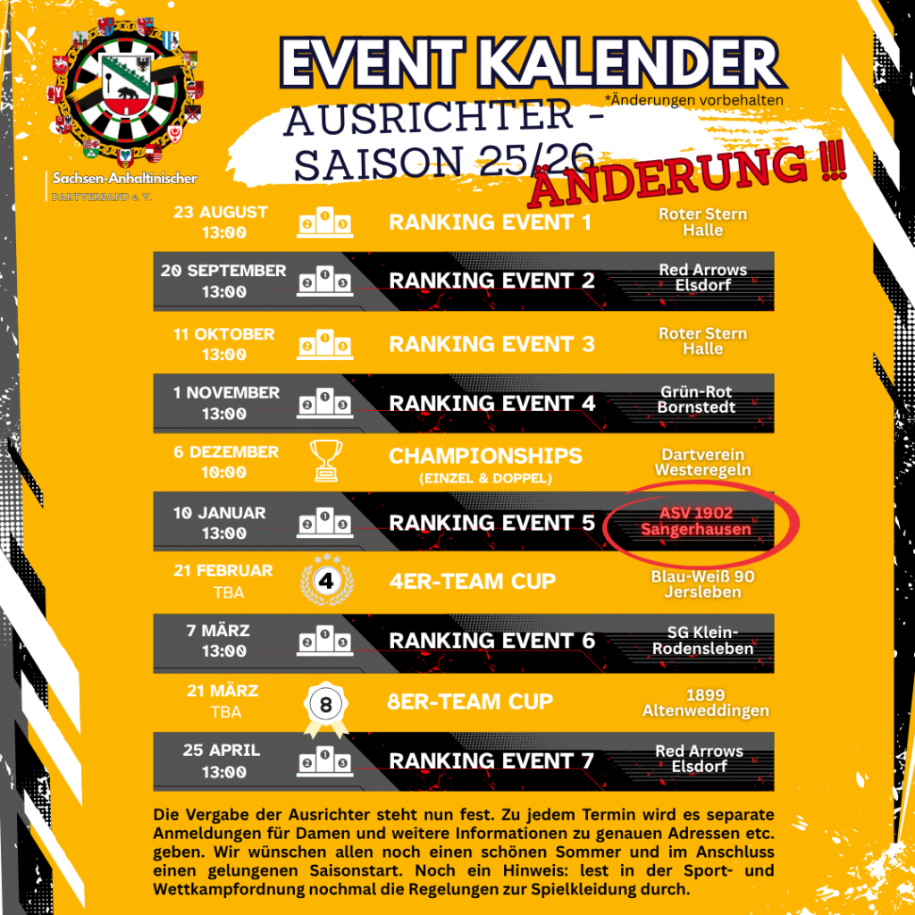 Wir haben nun für alle Events der Saison 2025/26 einen Ausrichter gefunden. Es gab noch eine kurzfristige Änderung für das Ranking Event #5. Wir wünschen all unseren Mitgliedern eine erfolgreiche Saison. Good Darts!