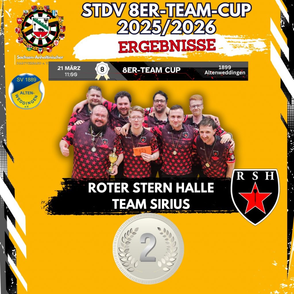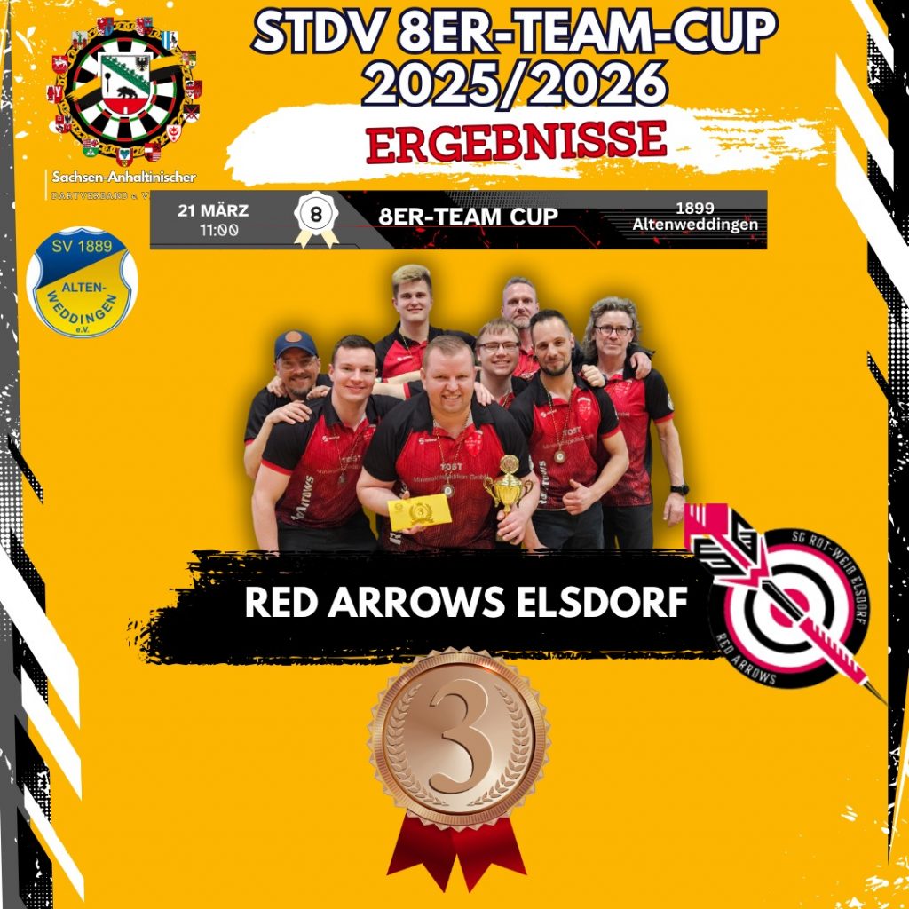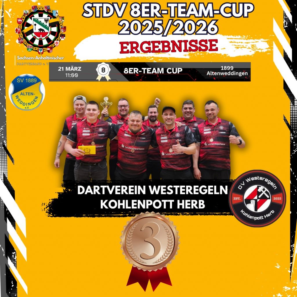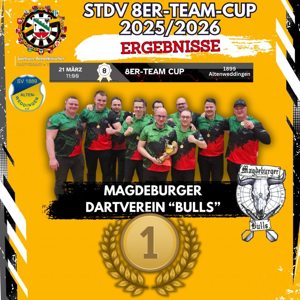 Einen Monat nach dem 4er-Team-Cup fand am 21.03.2026 zum ersten Mal in der Historie des STDV ein 8er-Team-Cup statt. 6 Teams hatten gemeldet und waren spielberechtigt. Gespielt wurde eine Gruppenphase Round Robin. Ein Match bestand aus 8 Einzeln und 4 Doppeln. Die Gastgeber vom SV 1899 Altenweddingen und die SG Klein-Rodensleben mussten bereits nach der Gruppenphase die Segel streichen. Die TOP4 kamen ins Halbfinale.